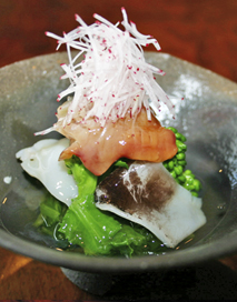 これから美味しくなる貝を使い春野菜を恋雫の香りを生かした酢のものにしました。普通の土佐酢にゼリーを入れることで食材ともよく絡み、恋雫の爽やかさで貝の磯の香りをより引き立てる事が出来ました。